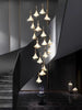 This creative flying fish stair chandelier is inspired by the flying fish in the ocean. It is made of zinc alloy and high-transmittance acrylic. After careful electroplating, polishing and other processes, the contemporary art aesthetics and nature are perfectly integrated.The piece zips past your eyes in fine bronze wires, creating an elegant line drawing that captivates as much in the brightness of the day then in the calm of the night.